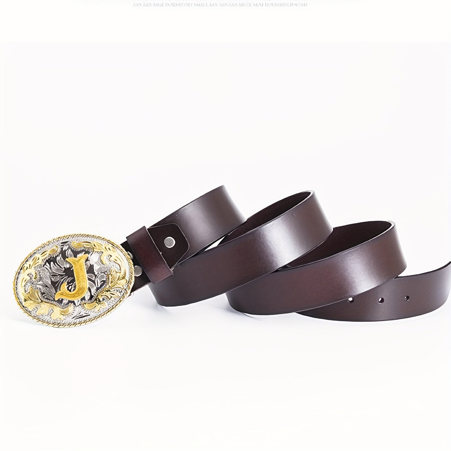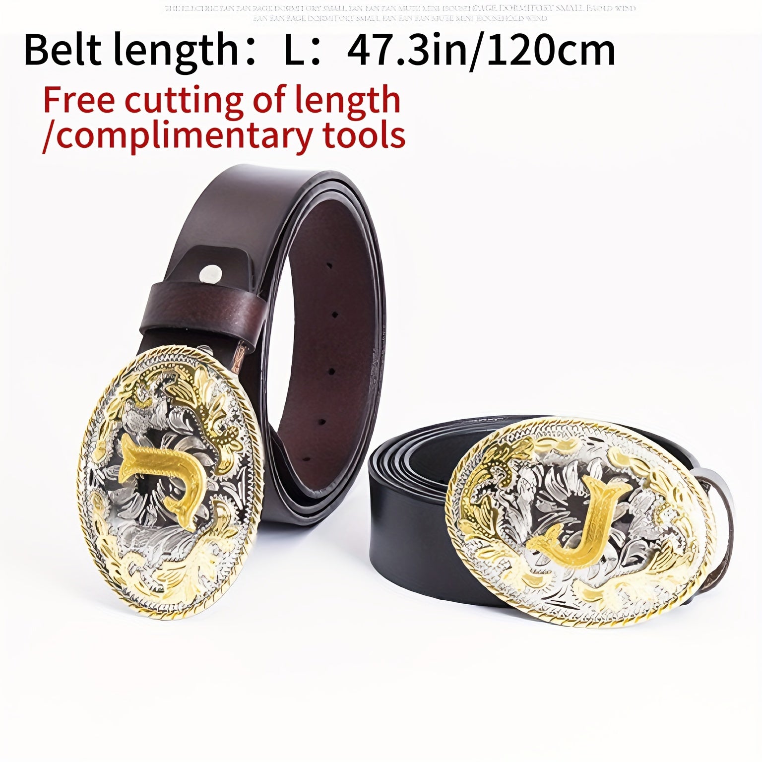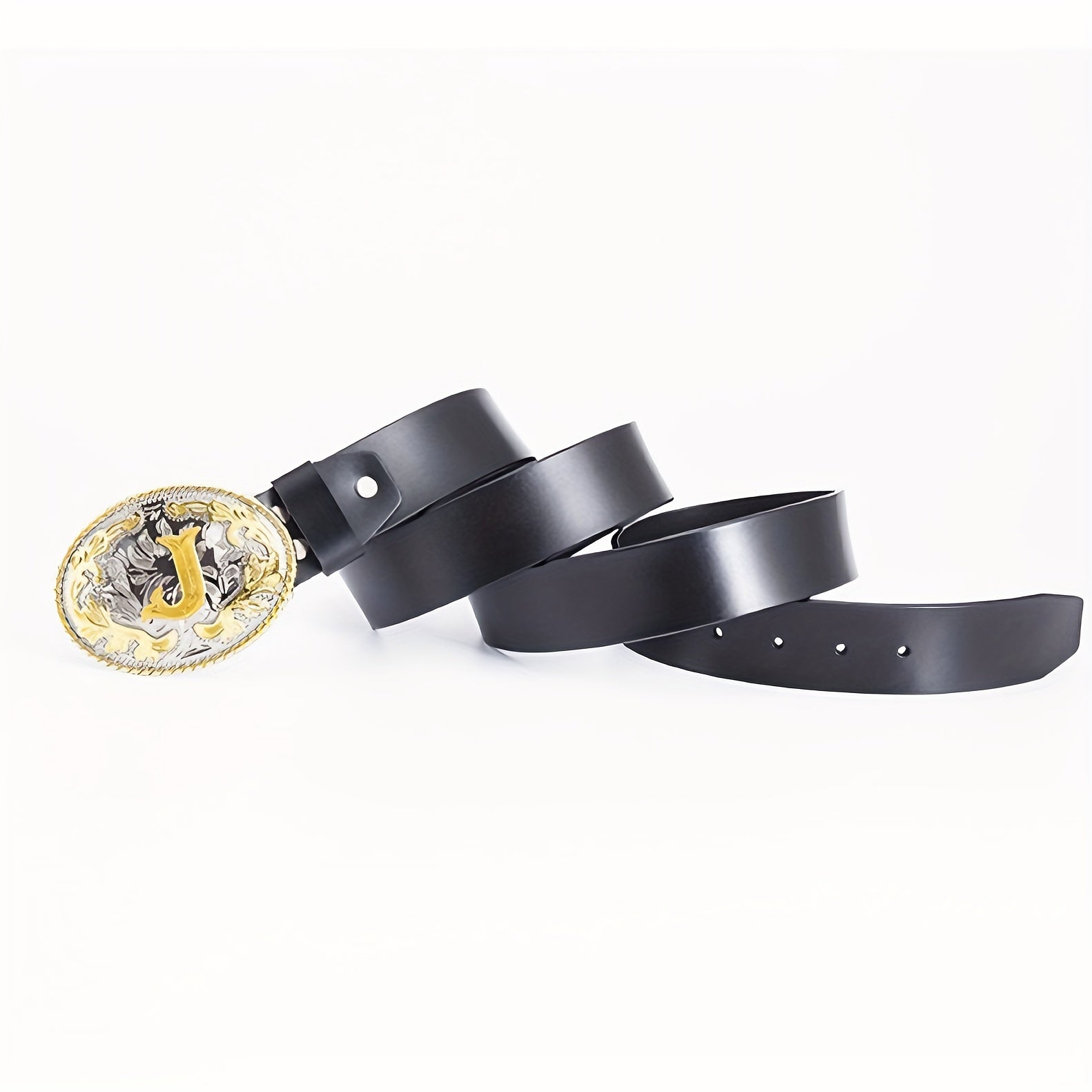 Add a touch of cowboy charm to your outfit with this funky leather belt featuring a golden J buckle. Perfect for Valentine's, Christmas, or spring fashion.