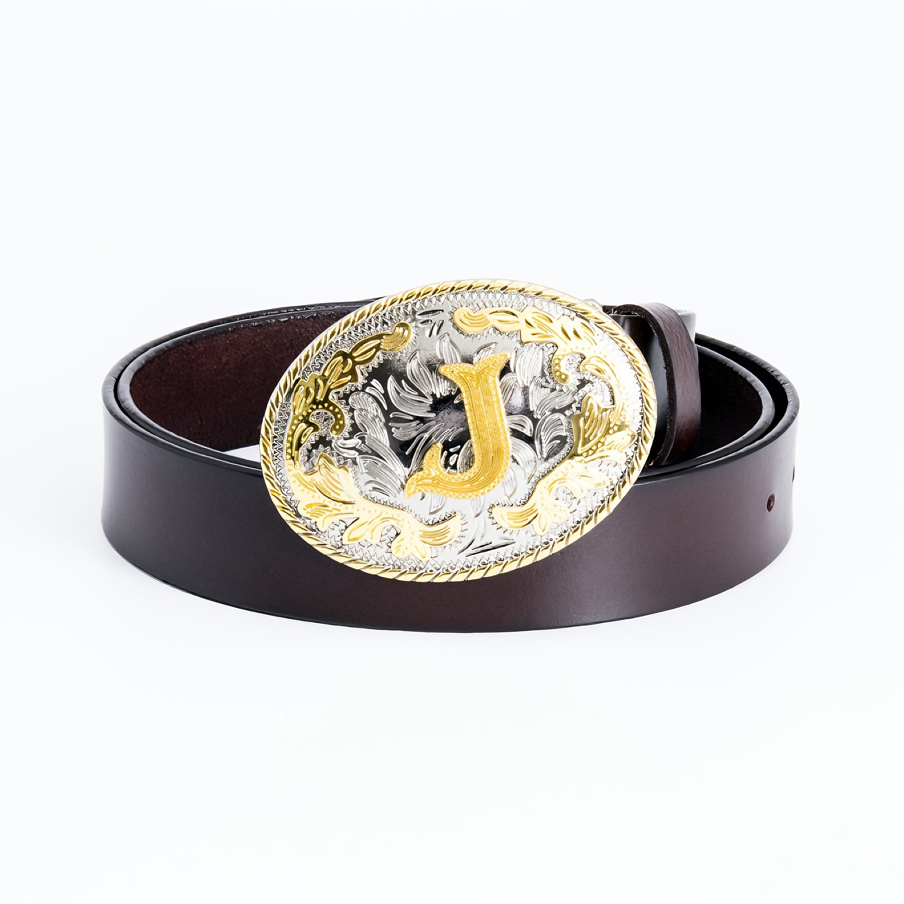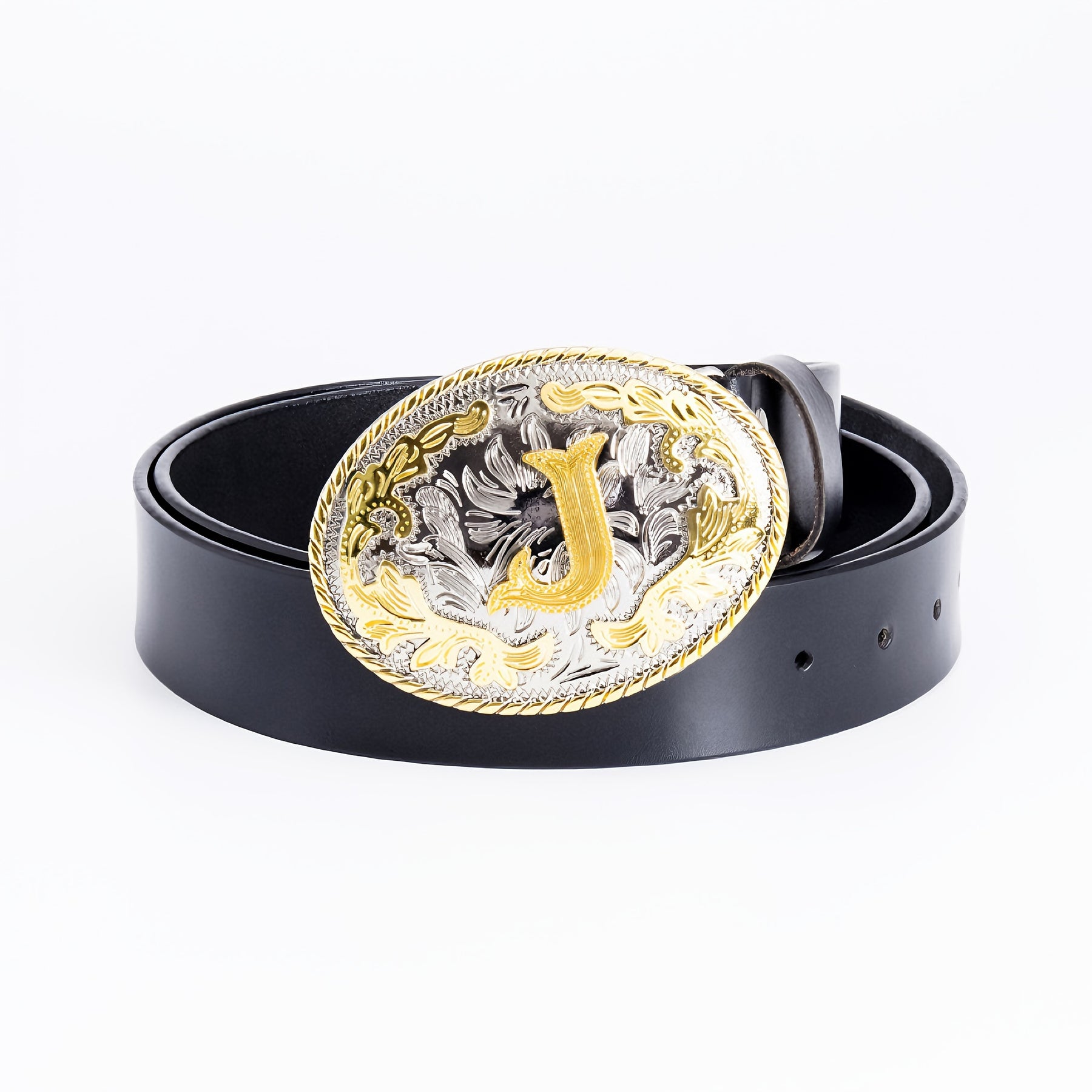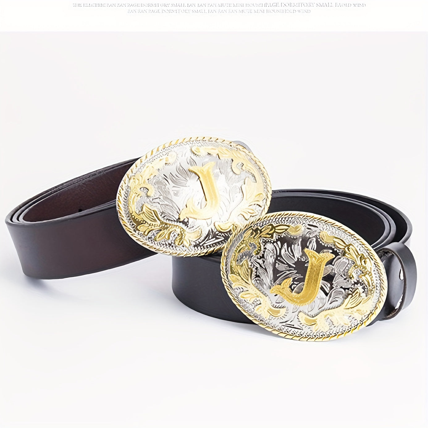 Add a touch of cowboy charm to your outfit with this funky leather belt featuring a golden J buckle. Perfect for Valentine's, Christmas, or spring fashion.