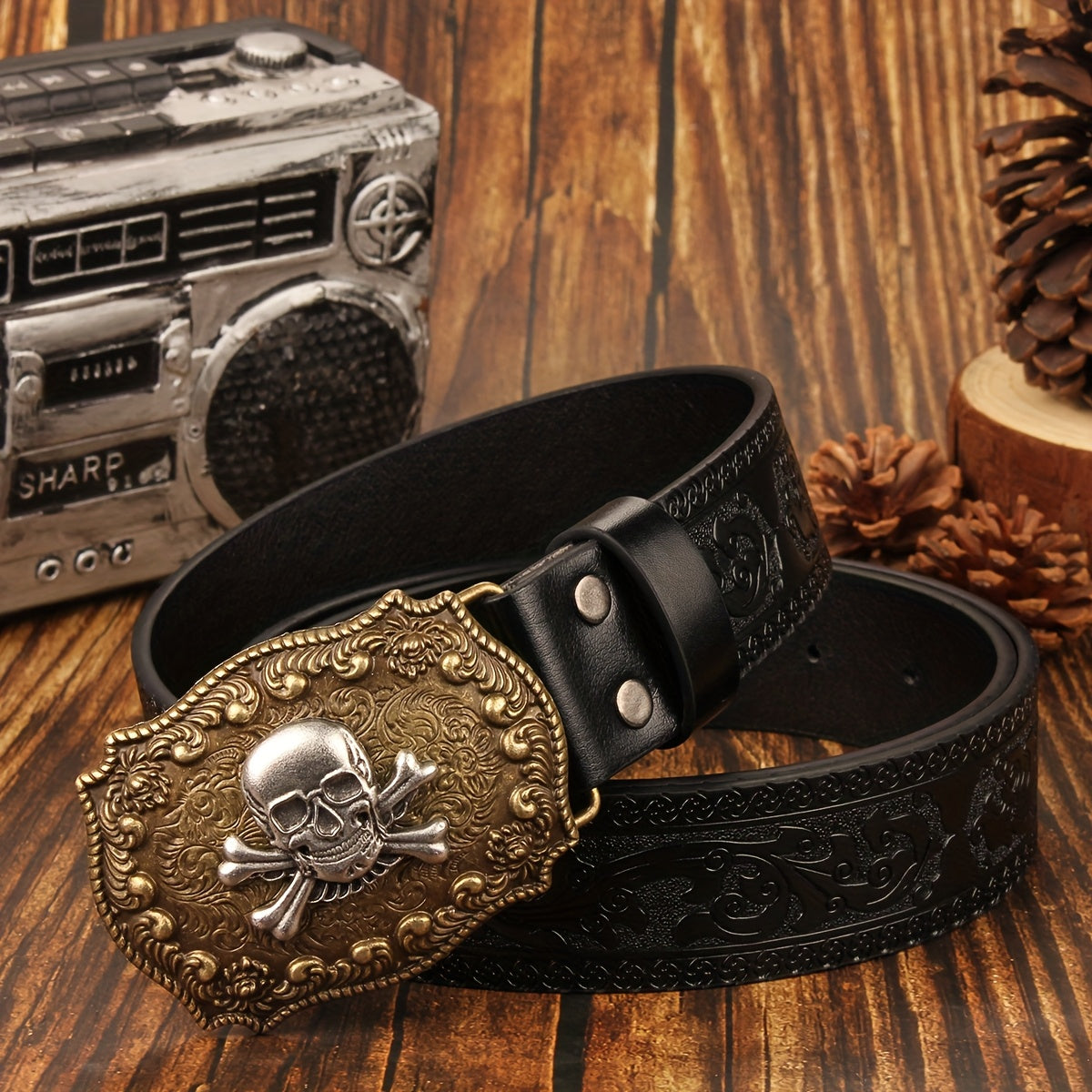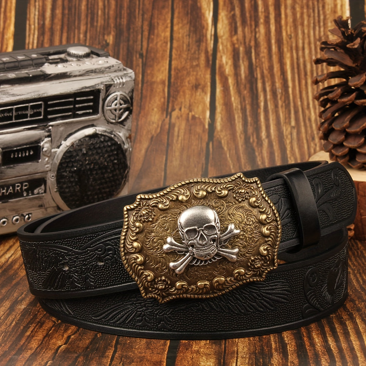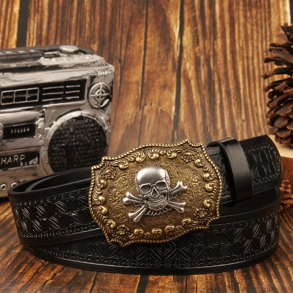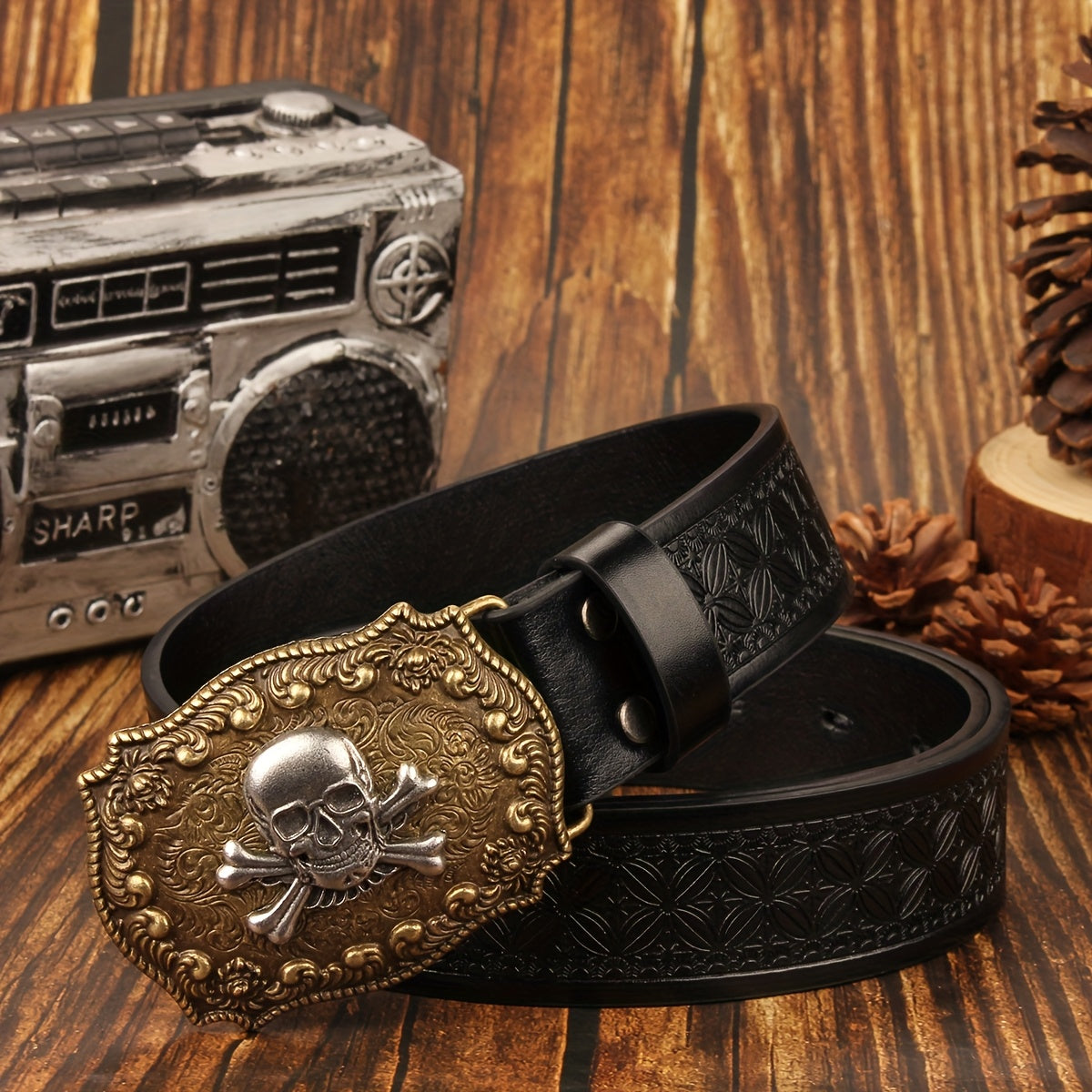 • Features a skull and floral design buckle