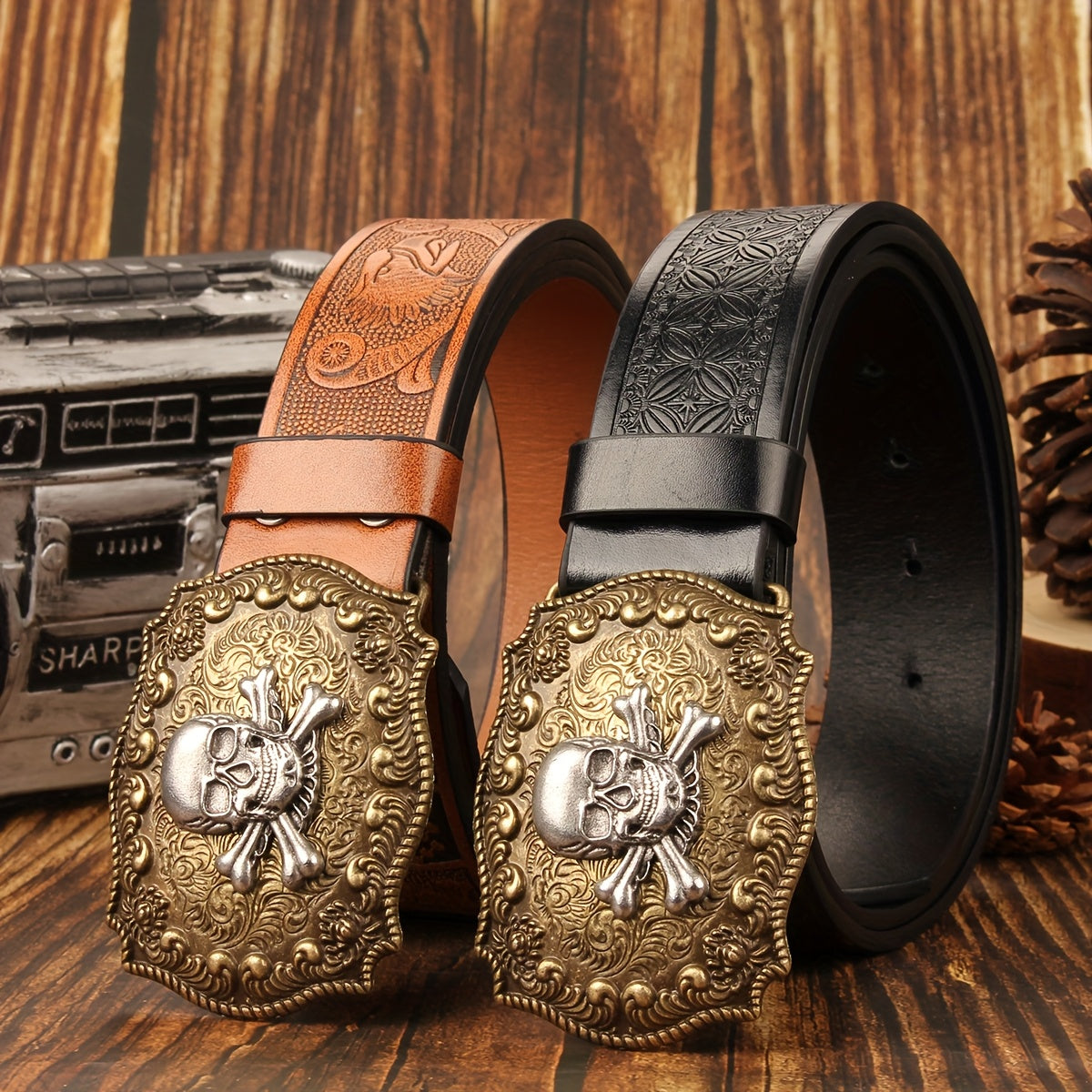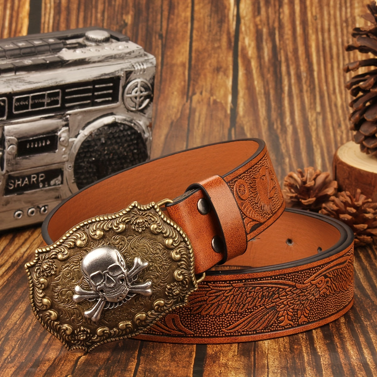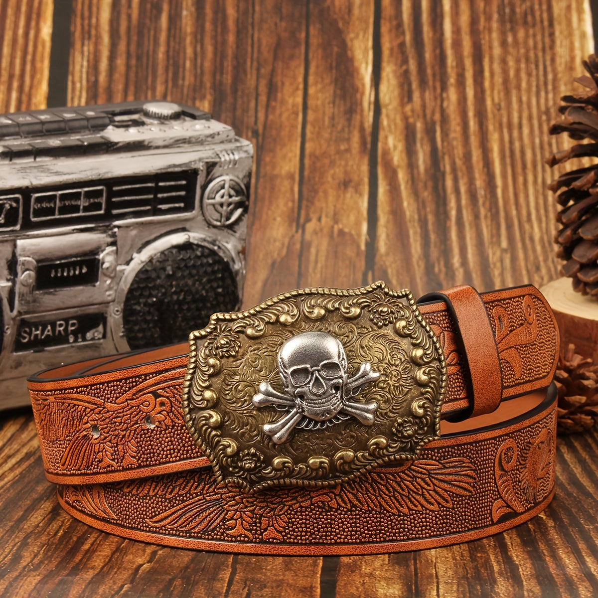 Vintage inspired belt featuring a skull and floral design buckle. Made of brown faux leather with perforated holes and a 3" wide smooth buckle. Ideal for men and women.