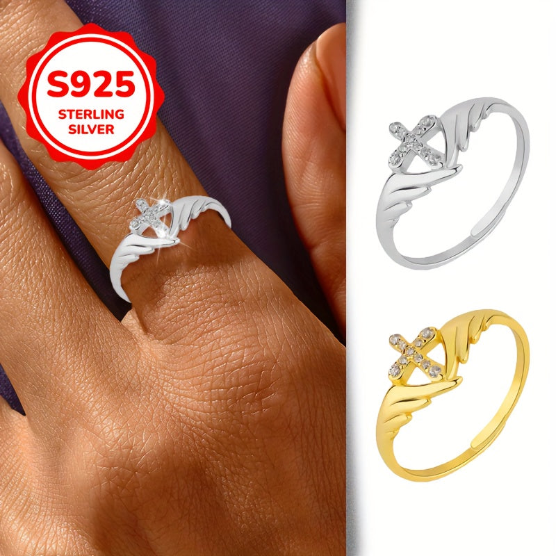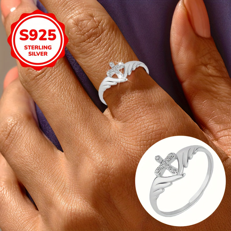 Embrace a touch of elegance with this open ring featuring wings and a cross adorned with sparkling cubic zirconia. Symbolize your faith and style.