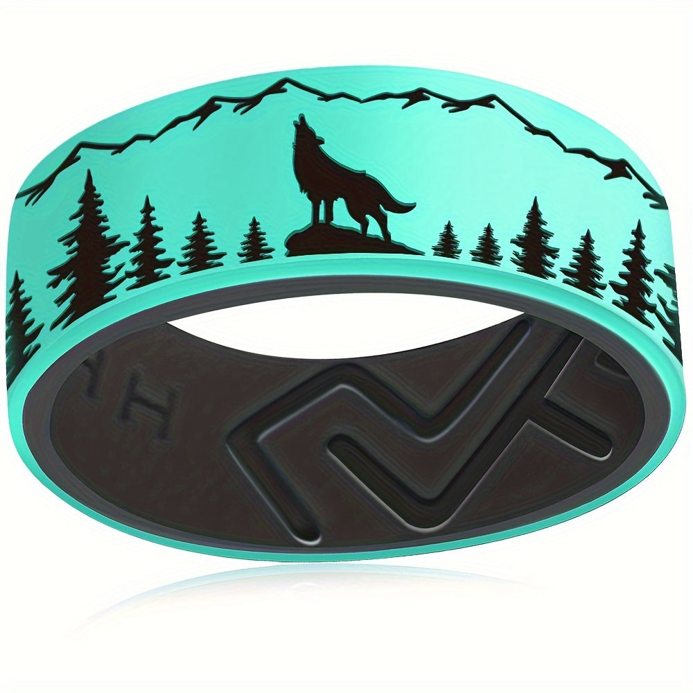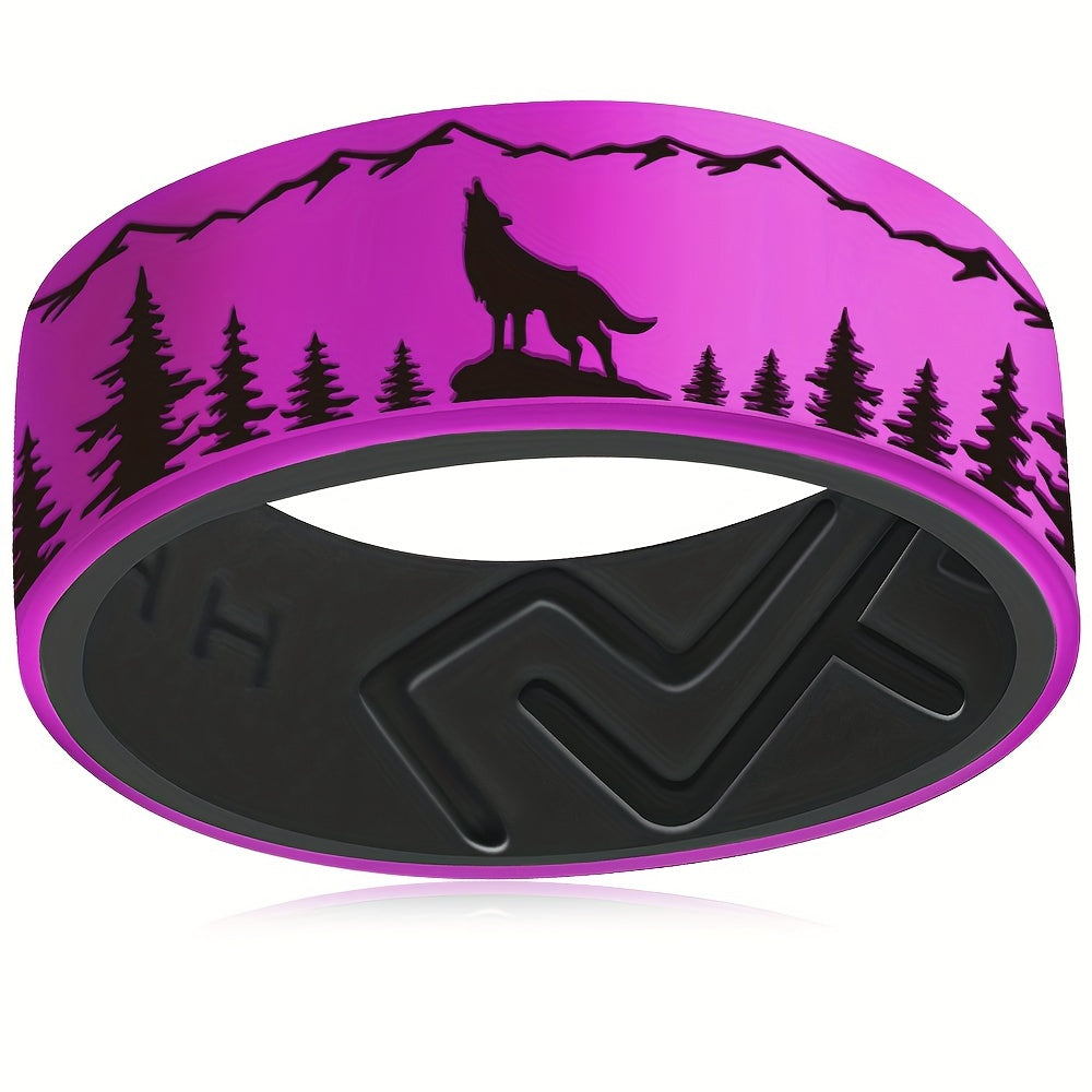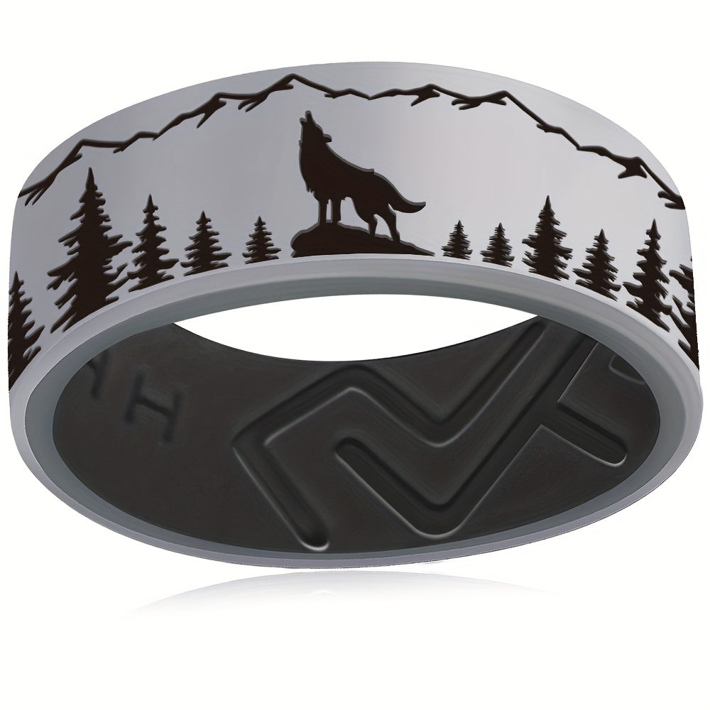 This engraved silicone ring features a wolf, forest, and mountain scenery design, ideal for outdoor enthusiasts. It's comfortable, breathable, and perfect for engagement, wedding, or anniversary gifts.