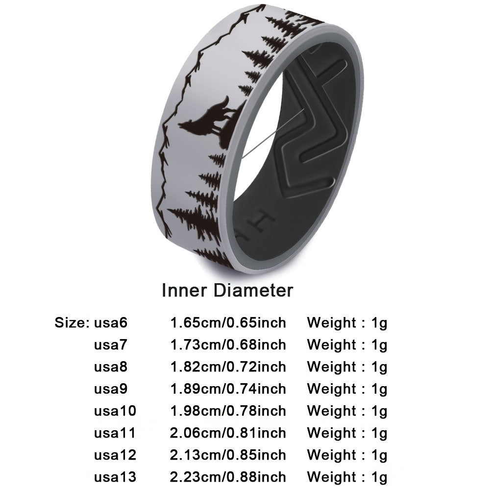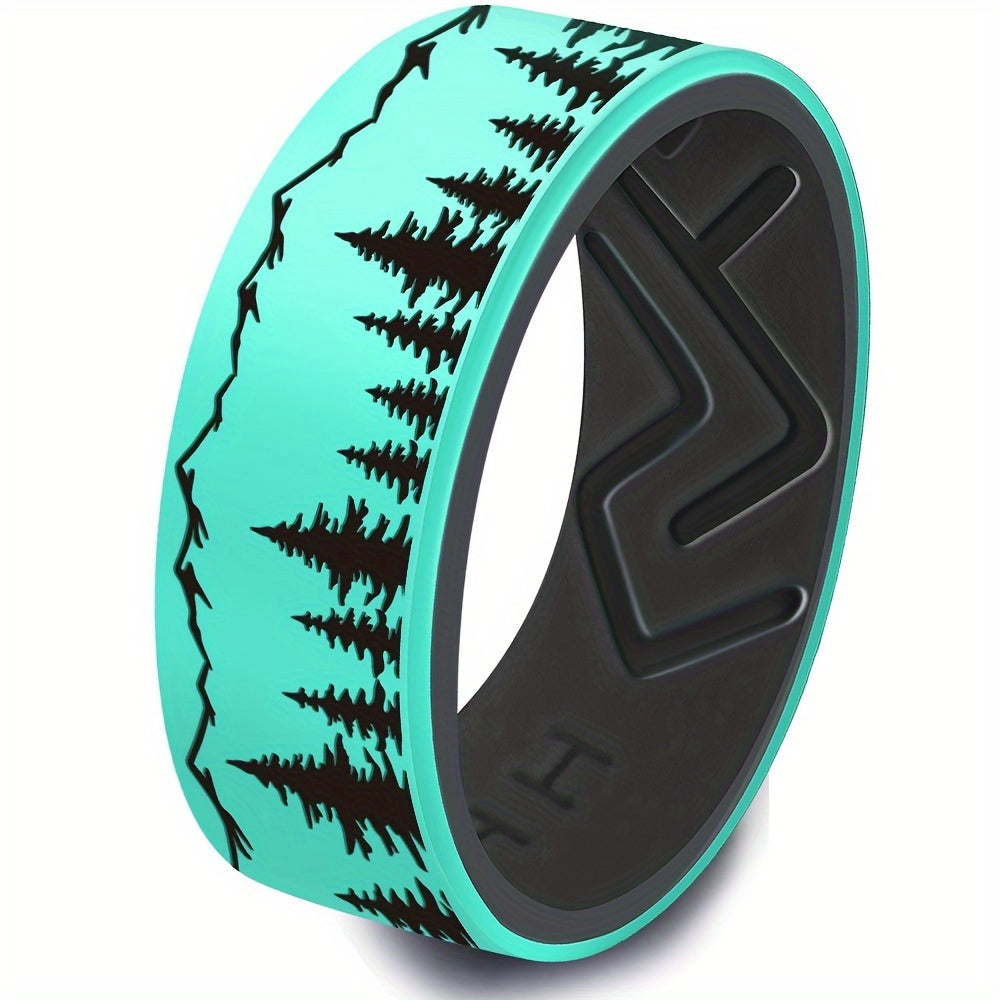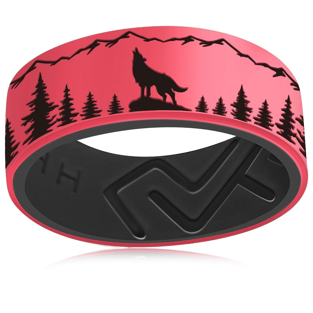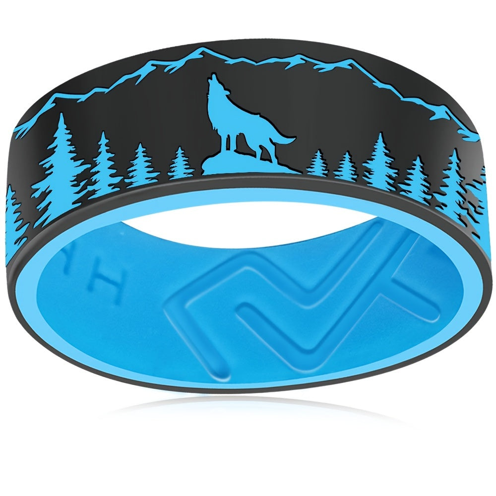 This engraved silicone ring features a wolf, forest, and mountain scenery design, ideal for outdoor enthusiasts. It's comfortable, breathable, and perfect for engagement, wedding, or anniversary gifts.