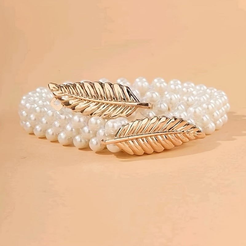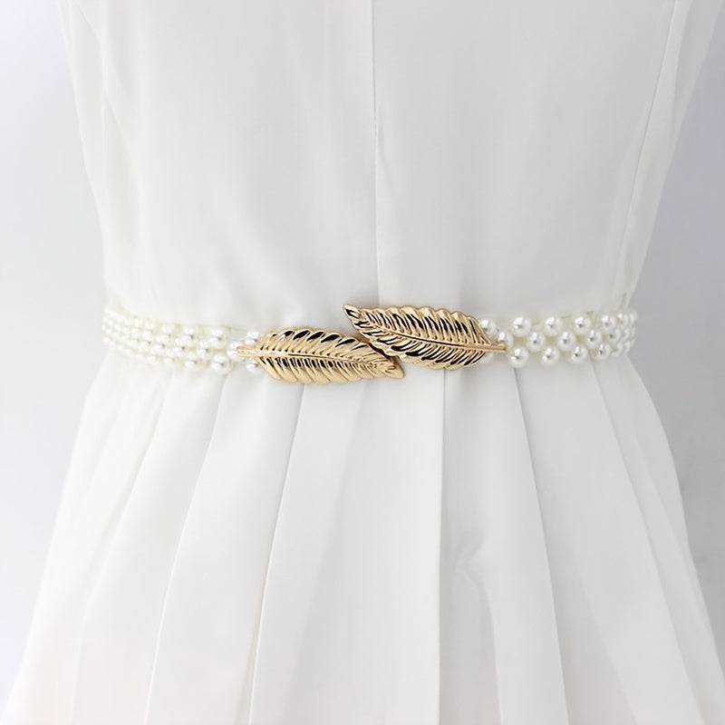 Elevate your look with this chic elastic waist chain belt featuring faux pearl and leaf charms. Perfect for weddings, parties, and casual outings.