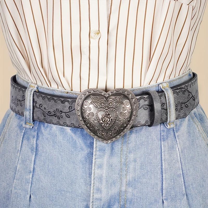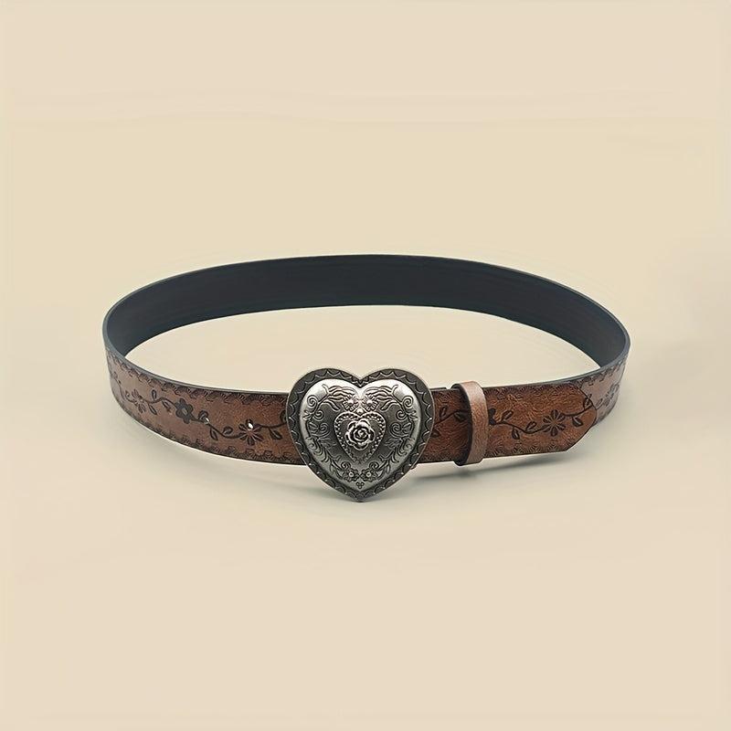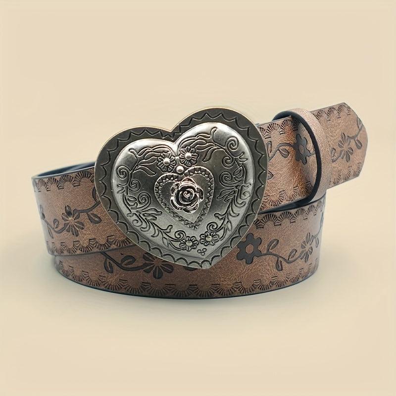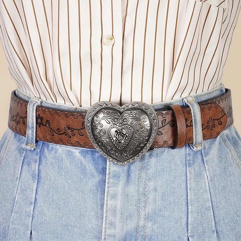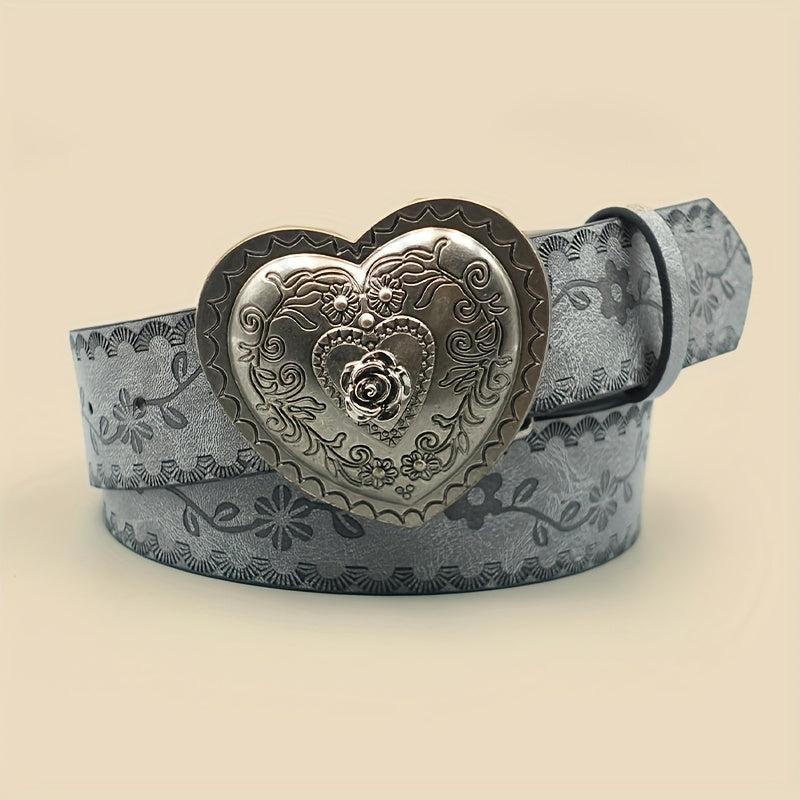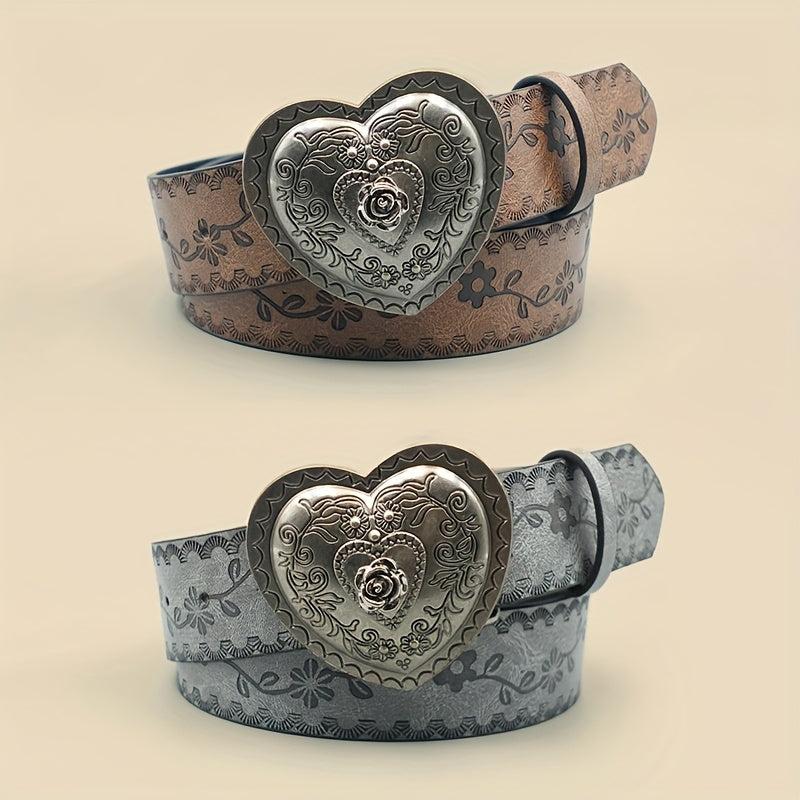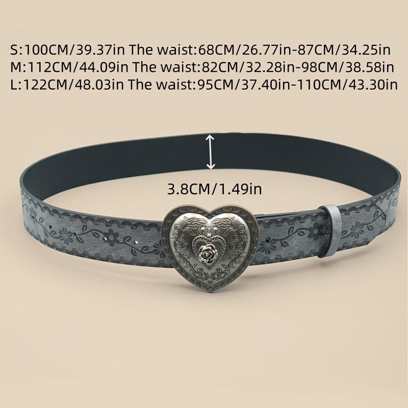 Add a touch of vintage punk style to your outfit with this carved heart belt. It features floral embossed texture and a metallic buckle, making it a perfect accessory for jeans, dresses, parties, beach outings, and more.