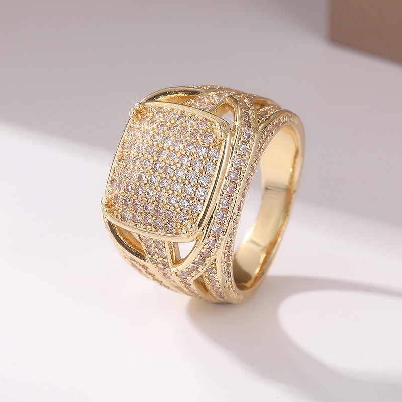This stunning statement ring features an intricate band made of KC golden plated copper with sparkling synthetic zirconia. Perfect for all seasons and makes a great gift for Father's Day. Ideal for weddings and special occasions.