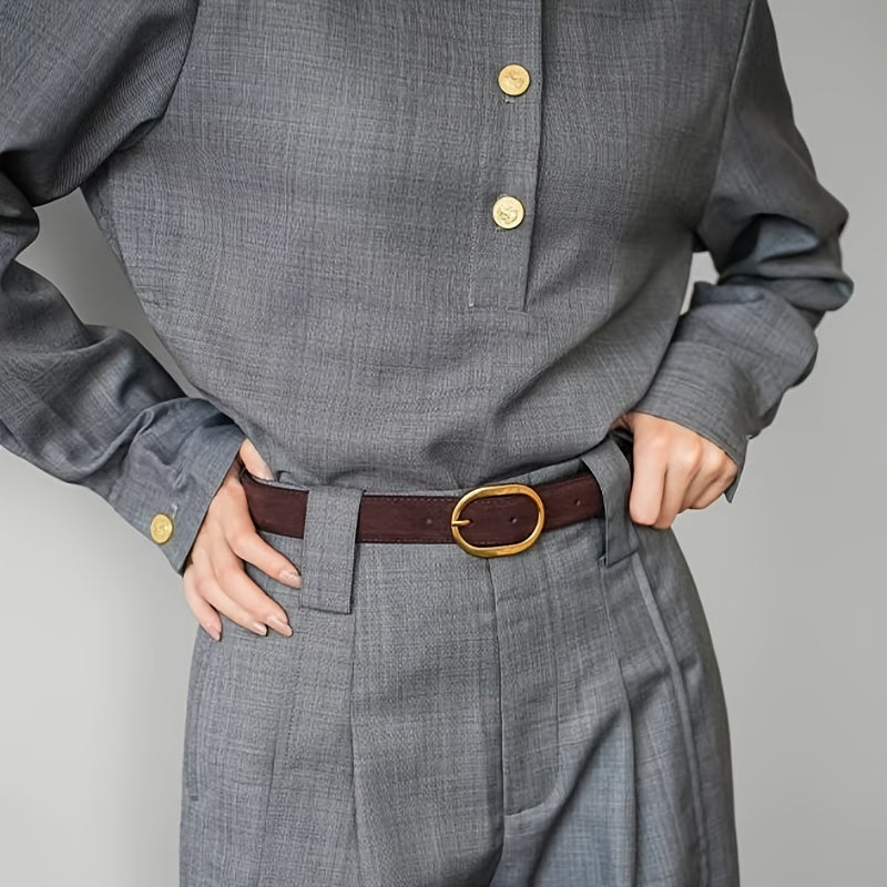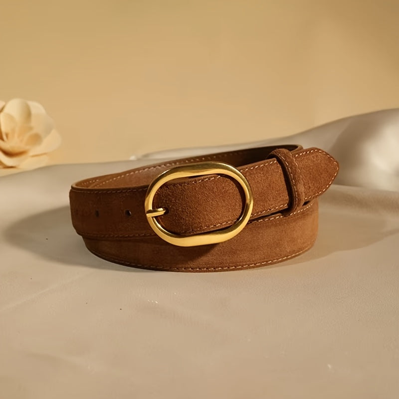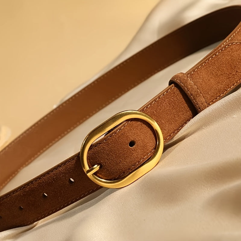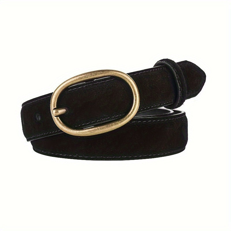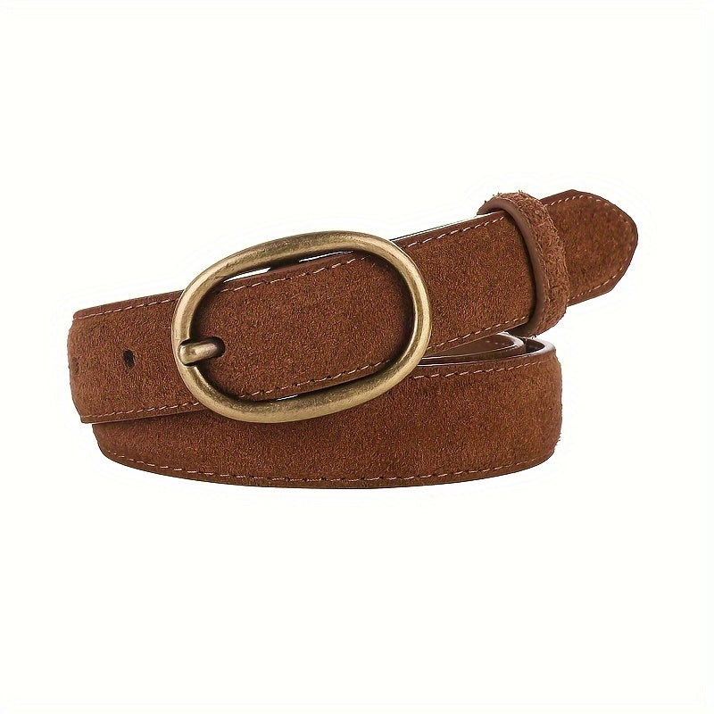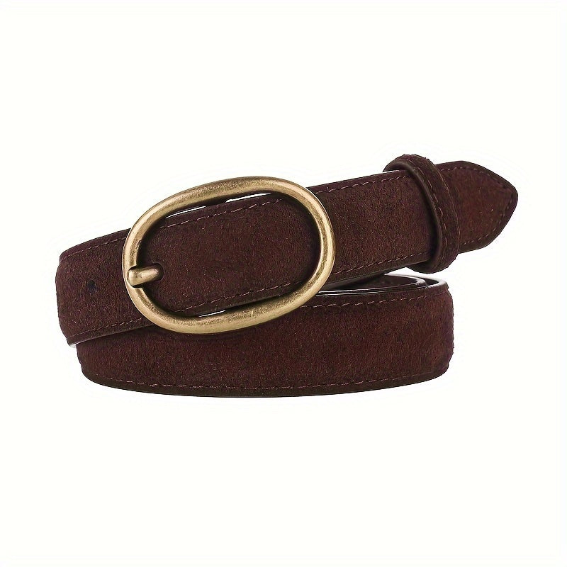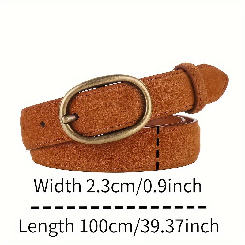 Add a touch of vintage charm to your outfit with this brown cowhide leather belt. It features a stylish metal pin buckle with a golden-toned oval buckle that complements both jeans and dresses. Available in 2 width options.