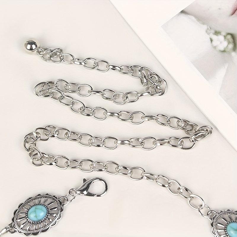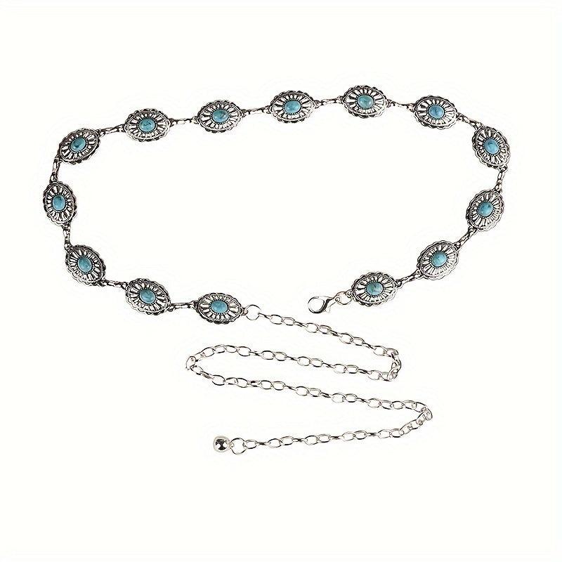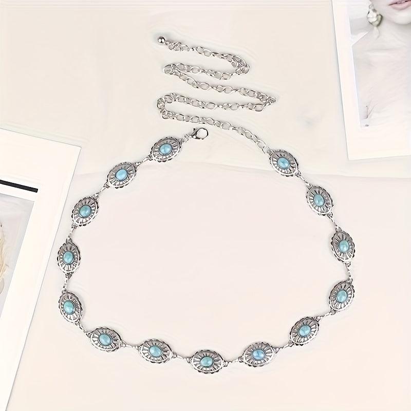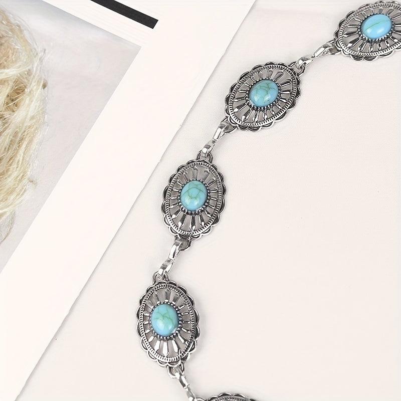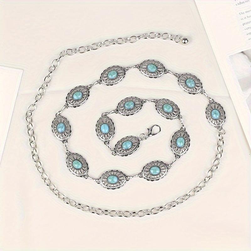 Add a touch of vintage elegance to your outfit with this turquoise belt. Made from high-quality materials, this belt is perfect for both casual and formal occasions.