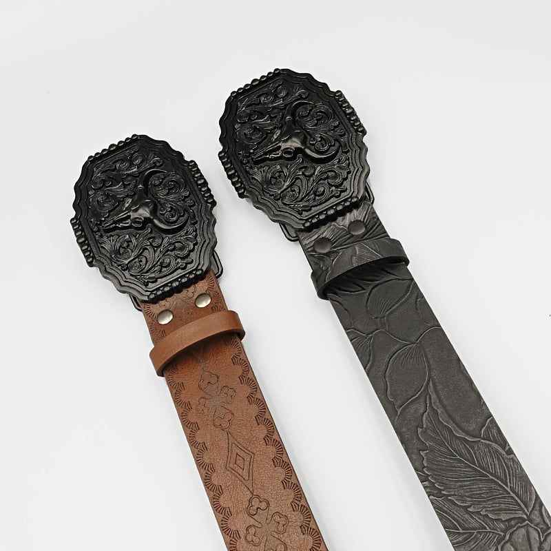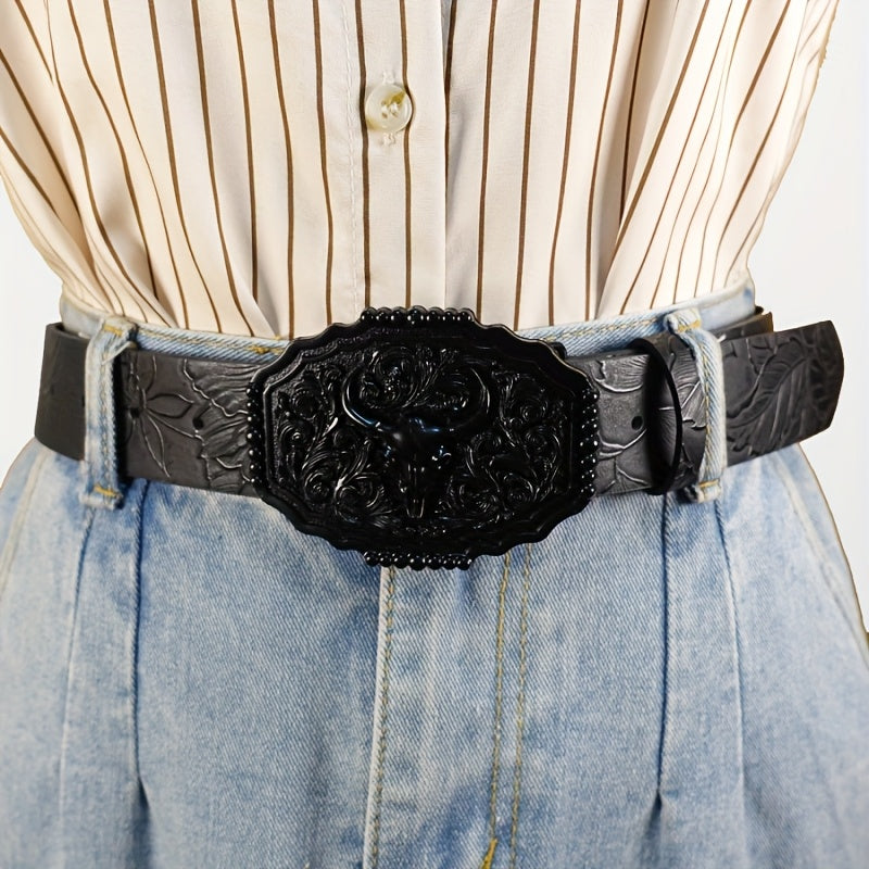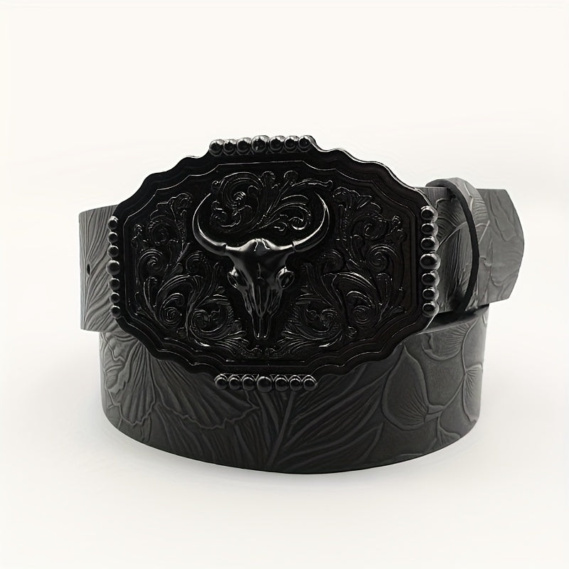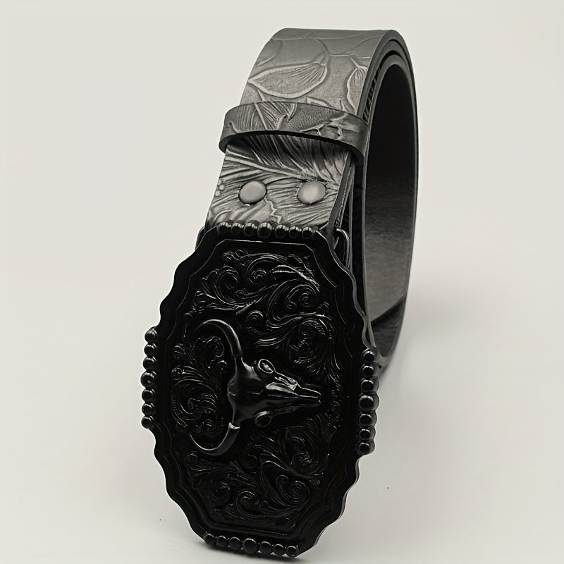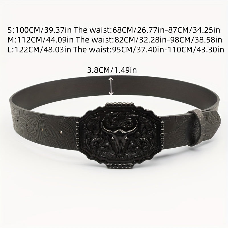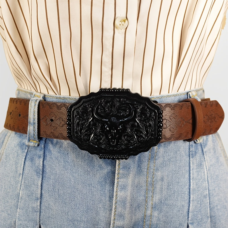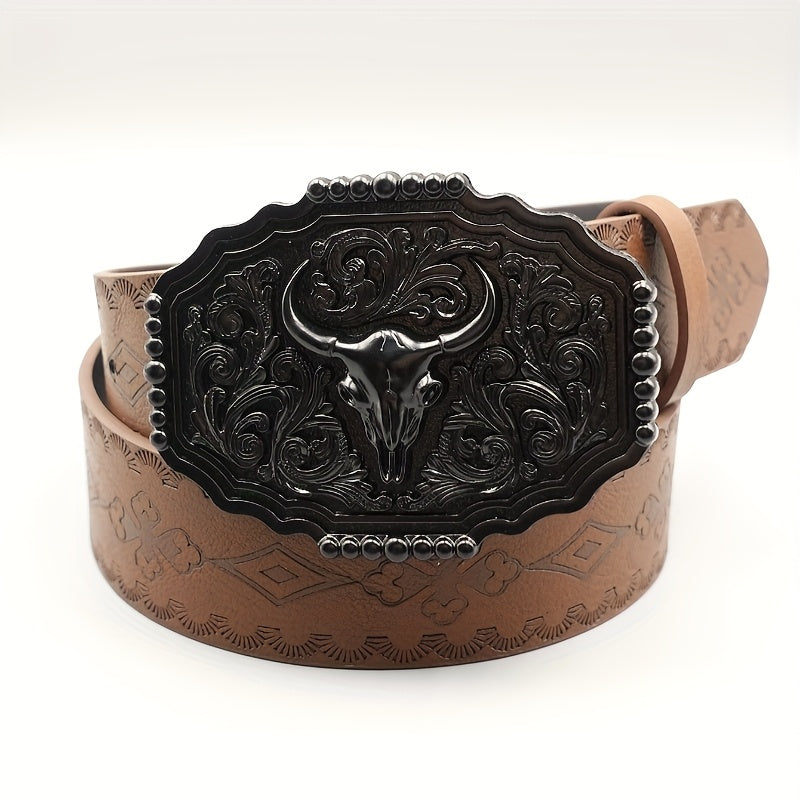 This vintage cowboy belt features an intricate bull head buckle and adjustable alloy metal accents, ideal for both casual attire and party wear.