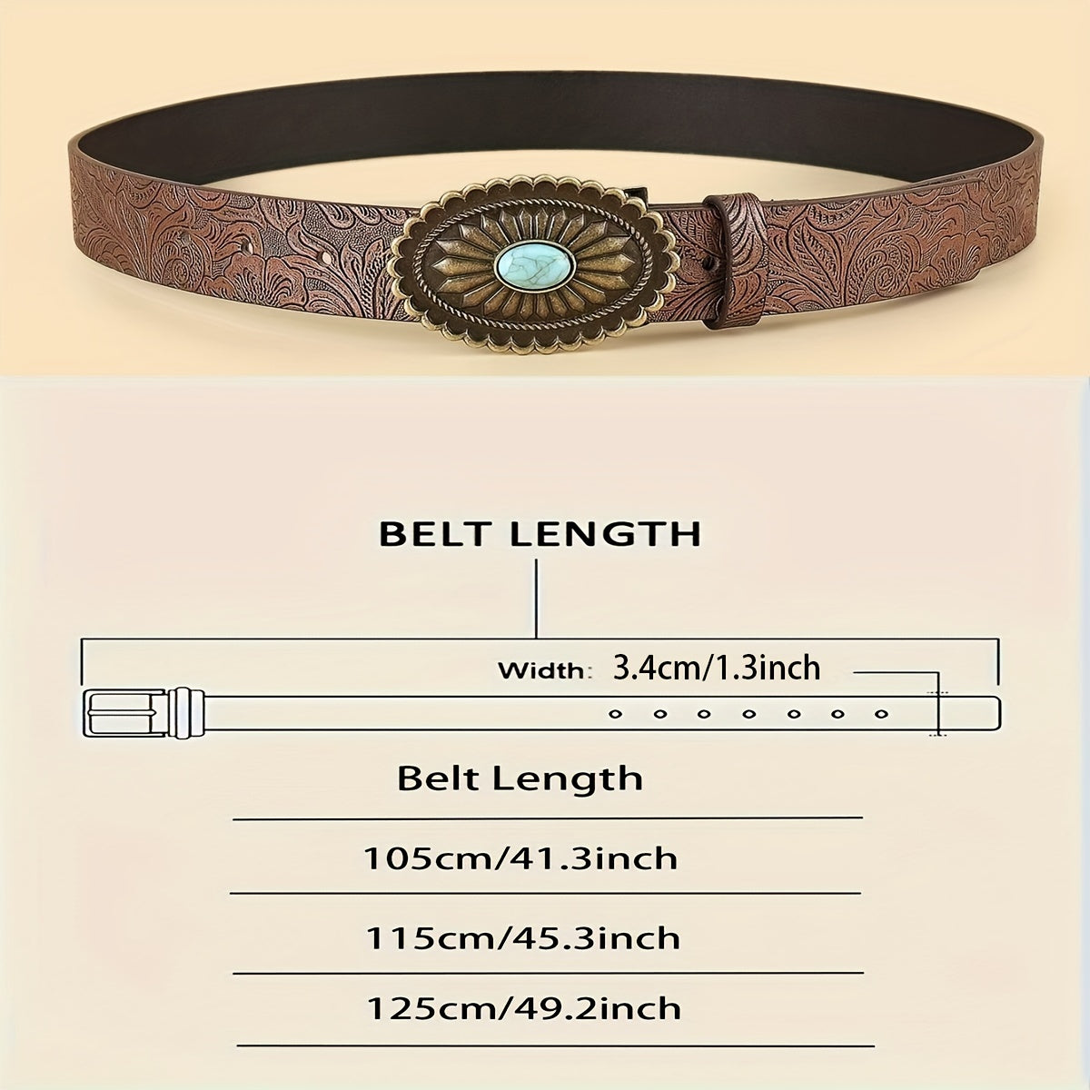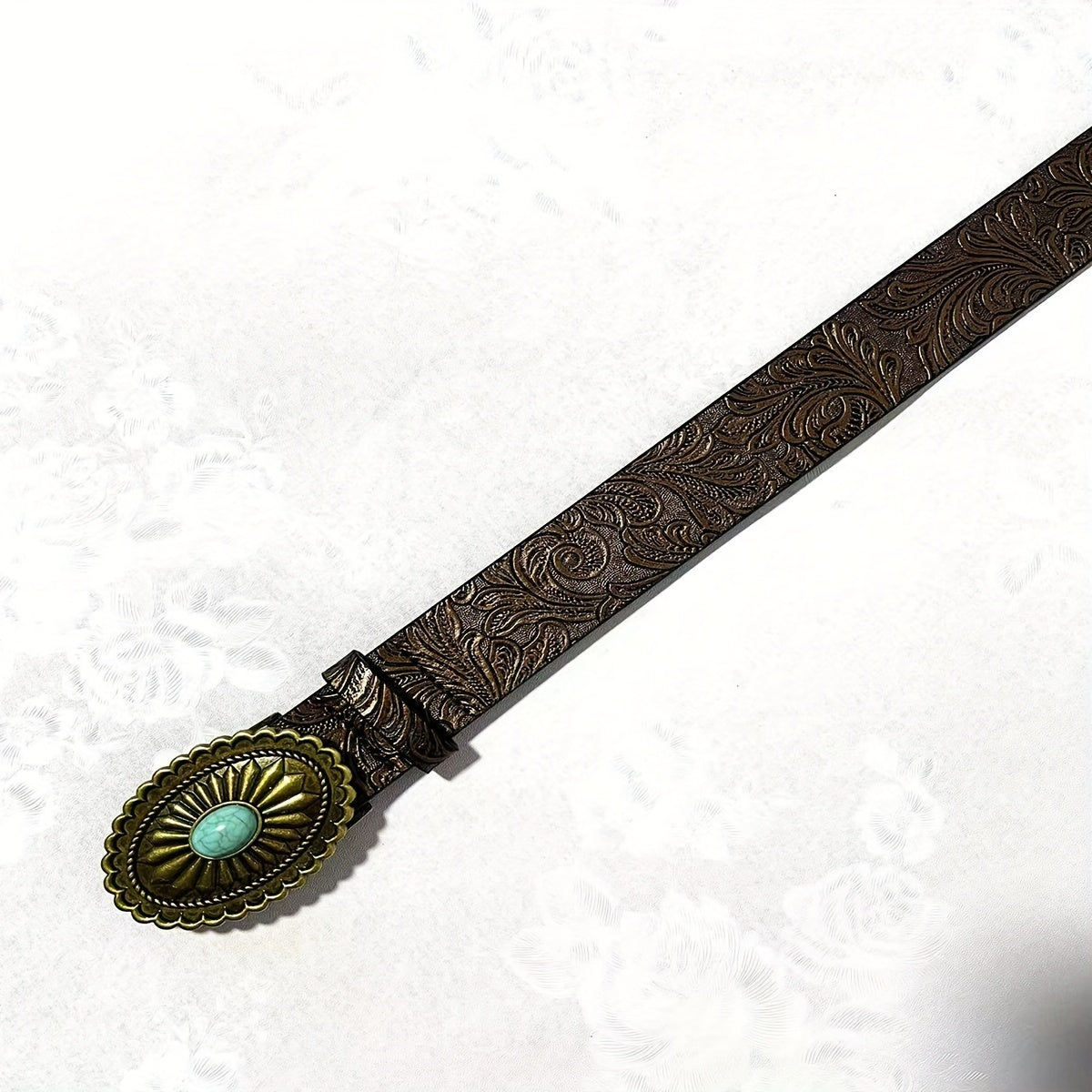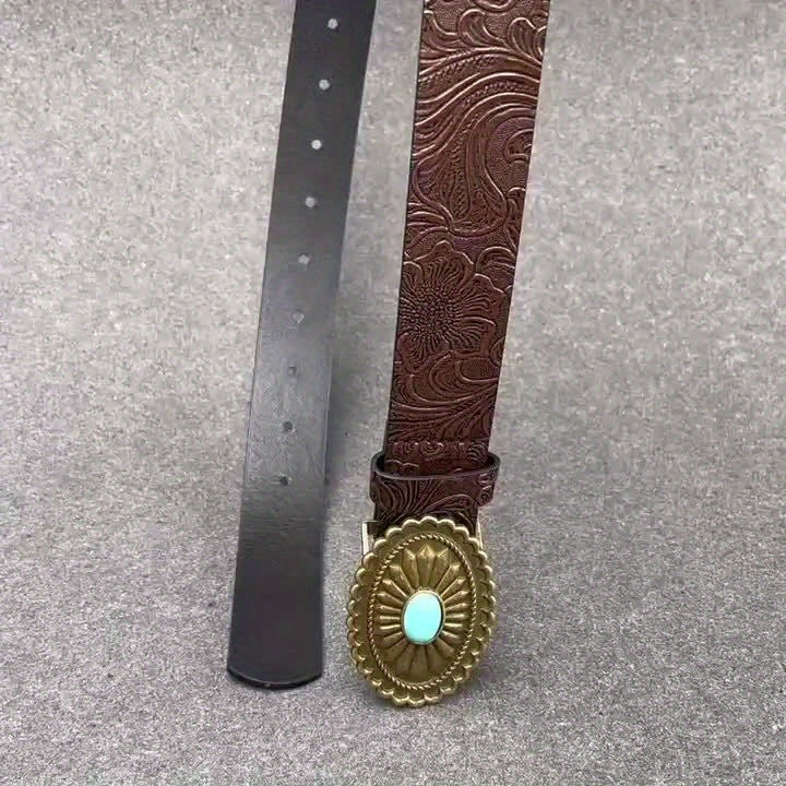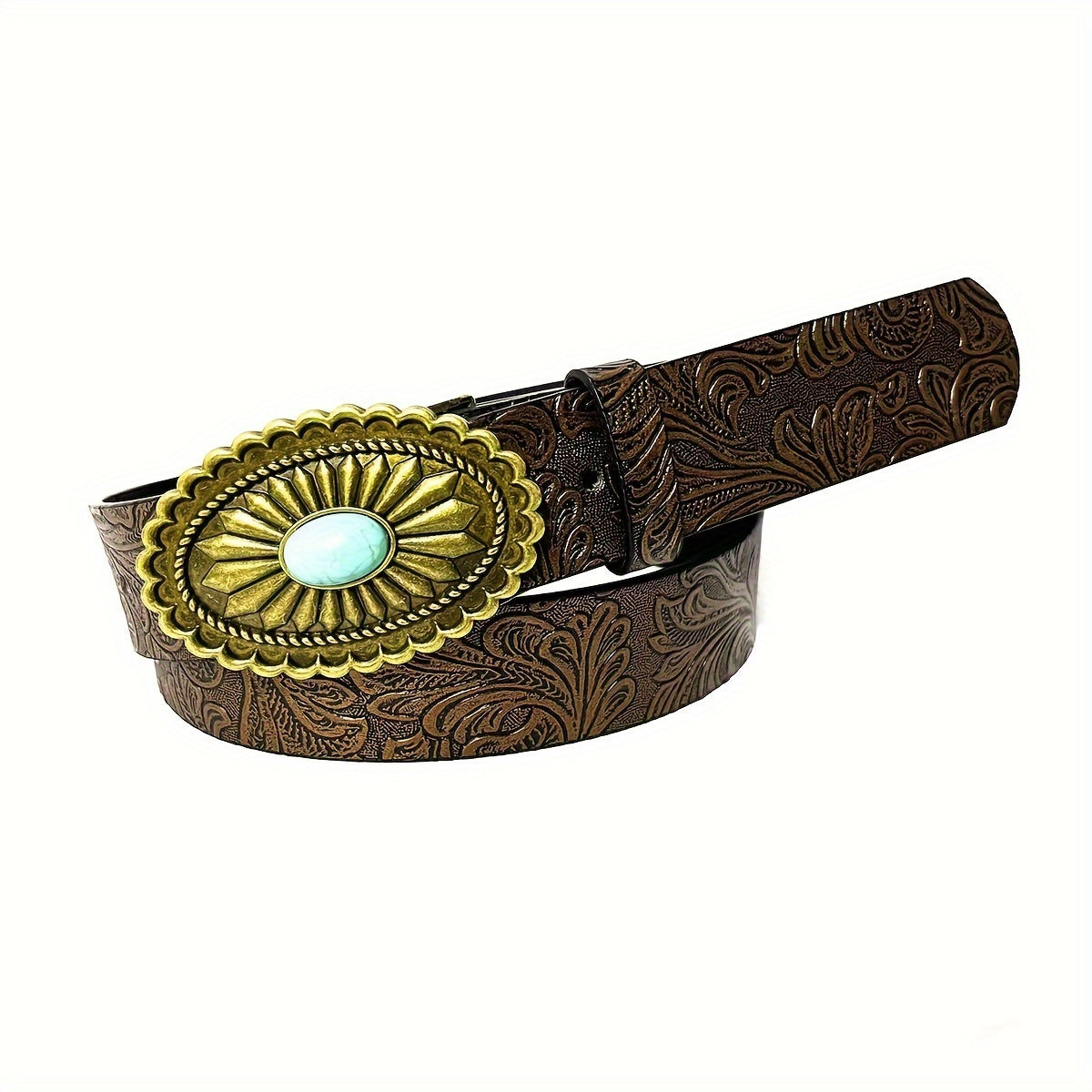 Add a touch of vintage charm to your outfit with this Western PU leather belt featuring a unique turquoise buckle and golden accents. Perfect for pairing with jeans, dresses, and casual wear.