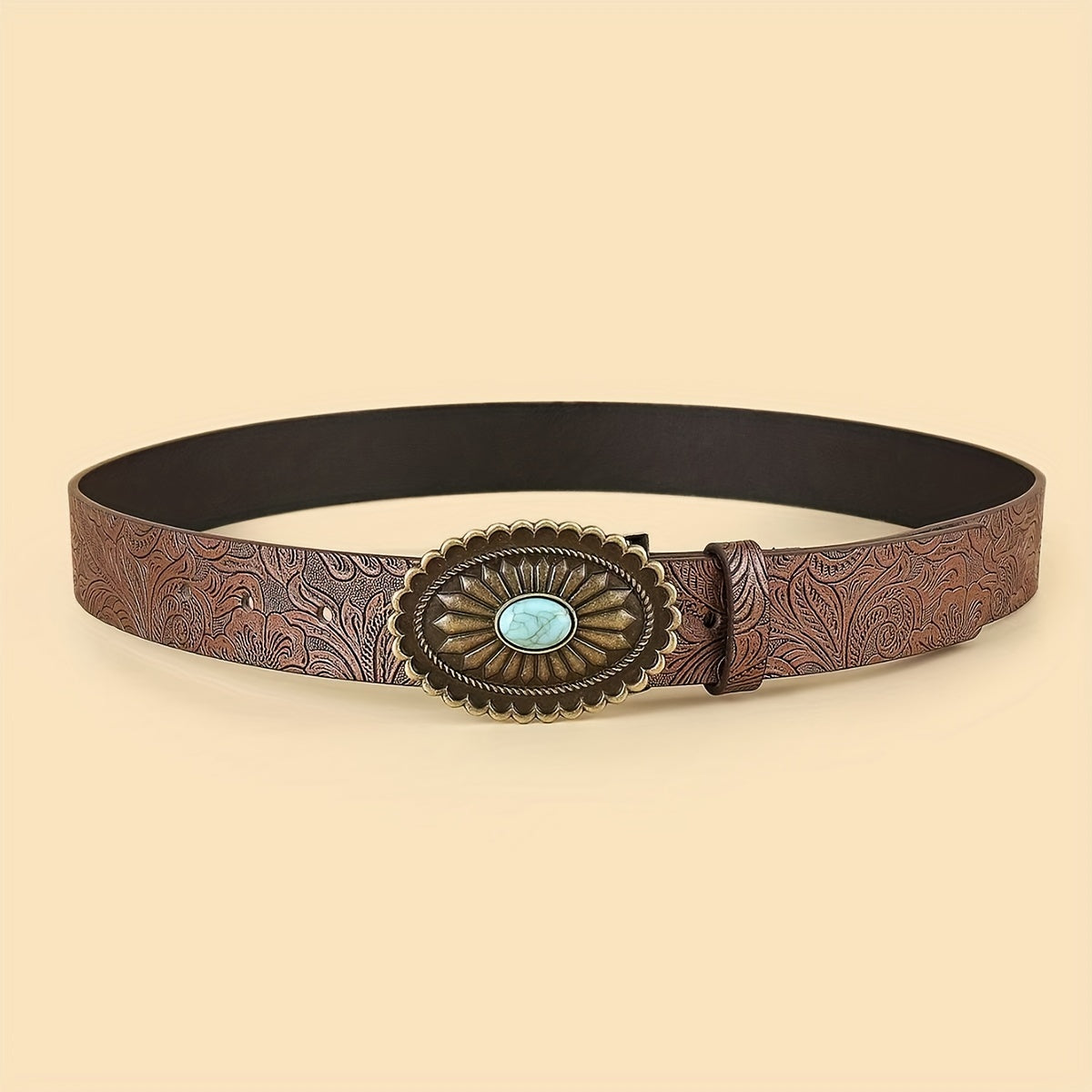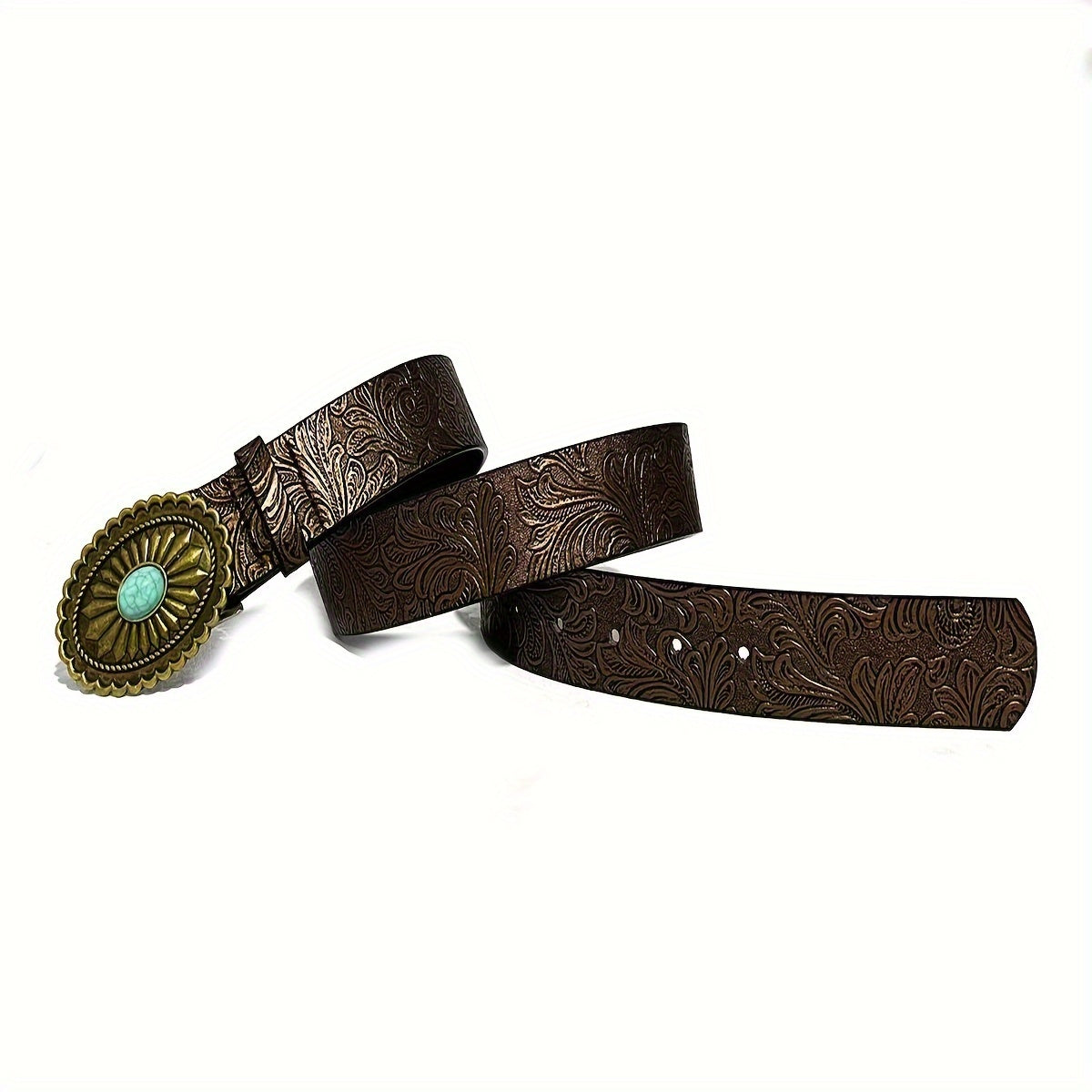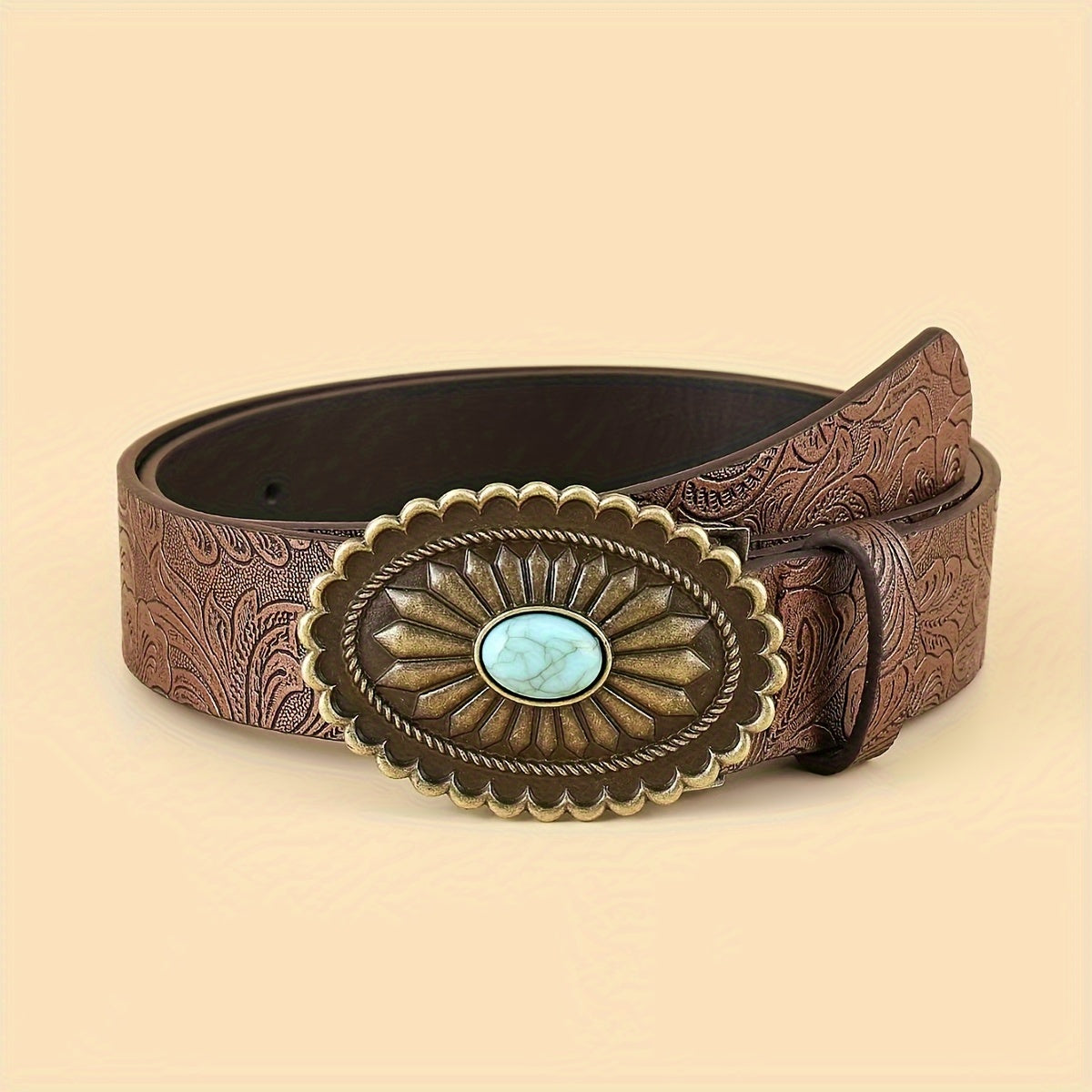 Add a touch of vintage charm to your outfit with this Western PU leather belt featuring a unique turquoise buckle and golden accents. Perfect for pairing with jeans, dresses, and casual wear.