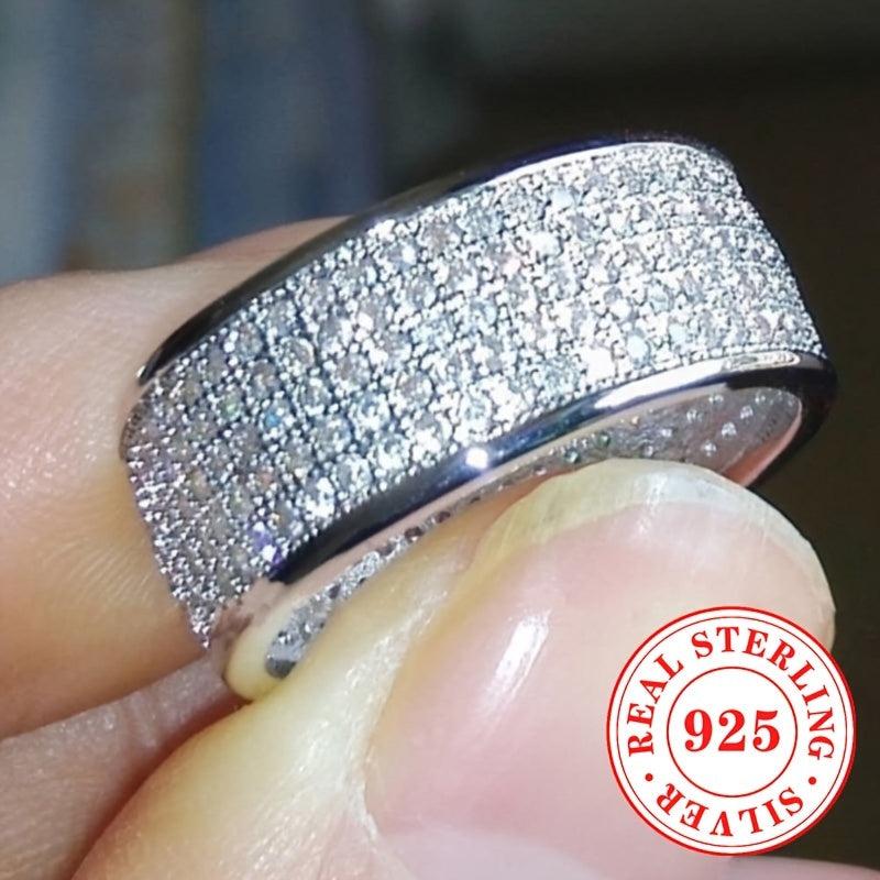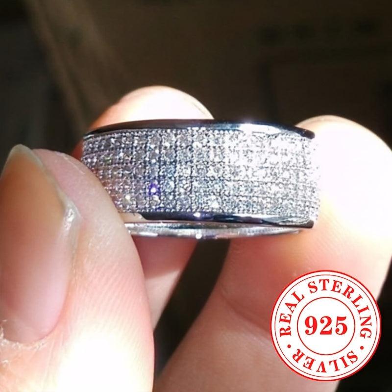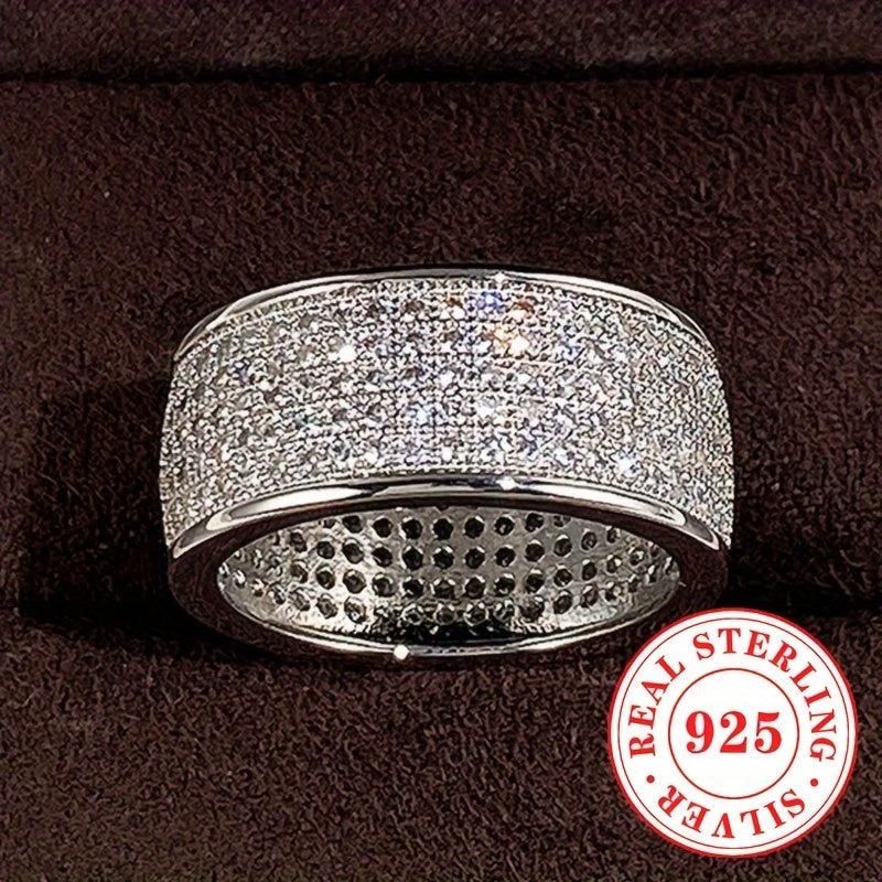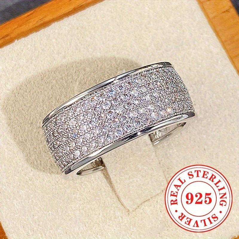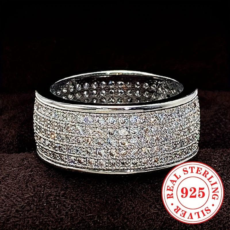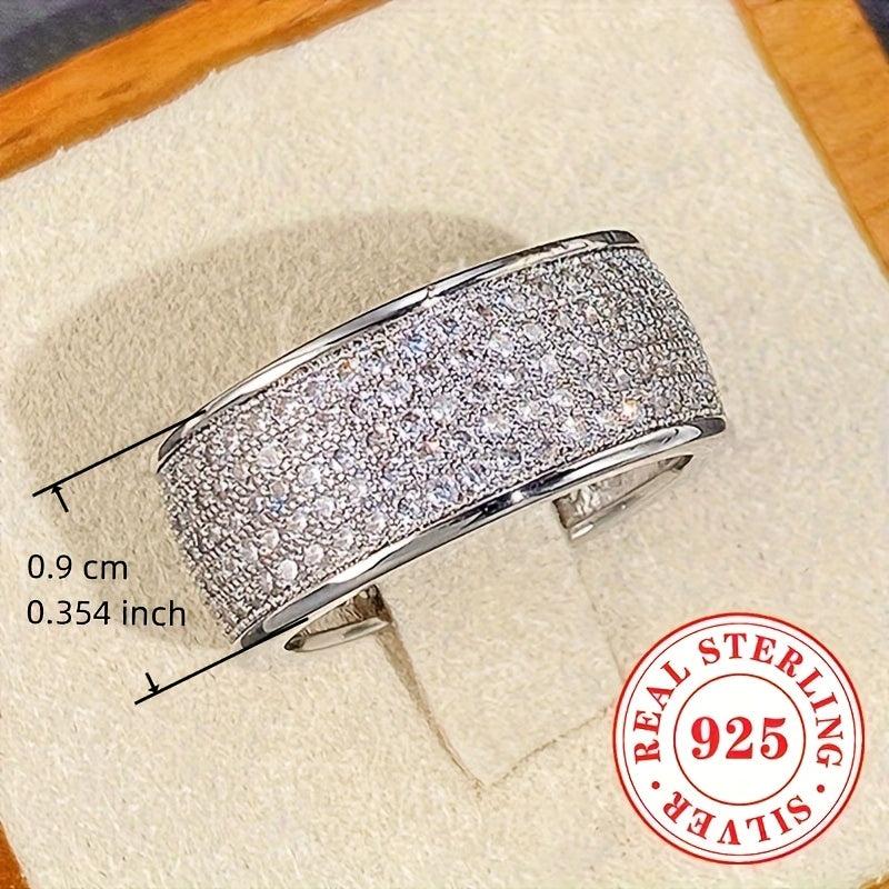 This exquisite ring features high-quality synthetic zirconia set in a wide band design. Crafted from S925 sterling silver, it is perfect for weddings and special occasions.