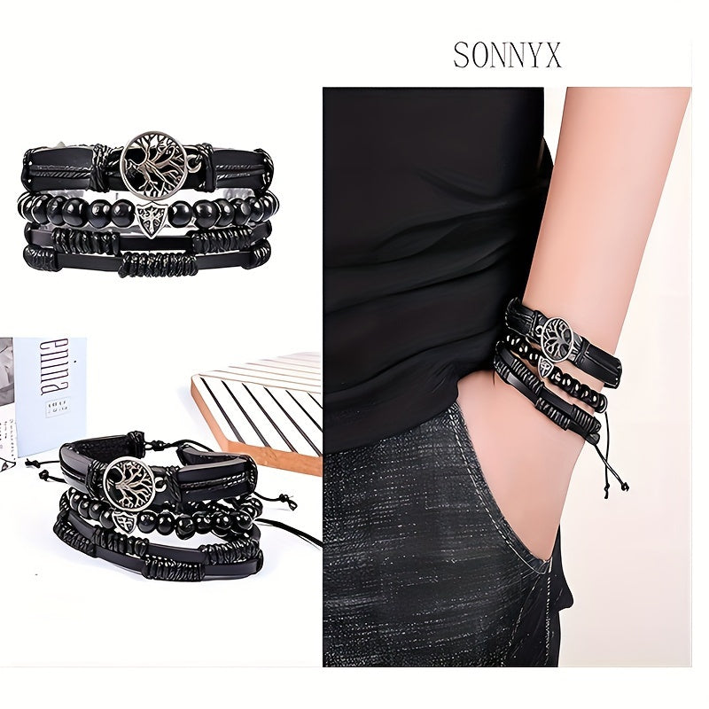 This woven faux leather bracelet is perfect for men and women. It features a tribal design with wood beads and an adjustable closure.