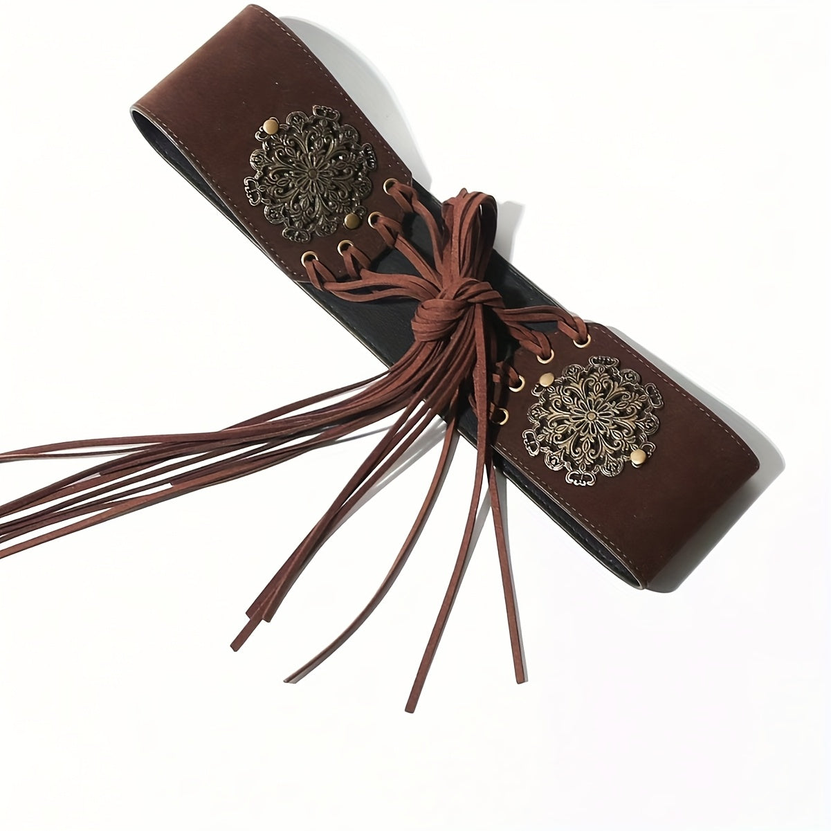 Enhance your outfit with this stylish faux leather waist belt featuring a tassel and round rivet detail. Perfect for parties, beach outings, casual days, weddings, and festive occasions.