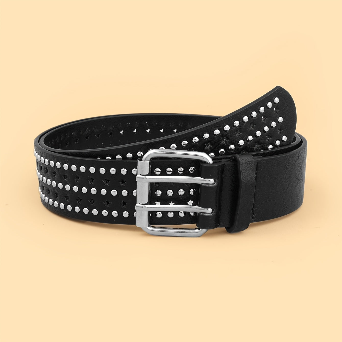Add a touch of punk style to your outfit with this rivet belt. Made of faux leather with star accent, this belt will make a statement.